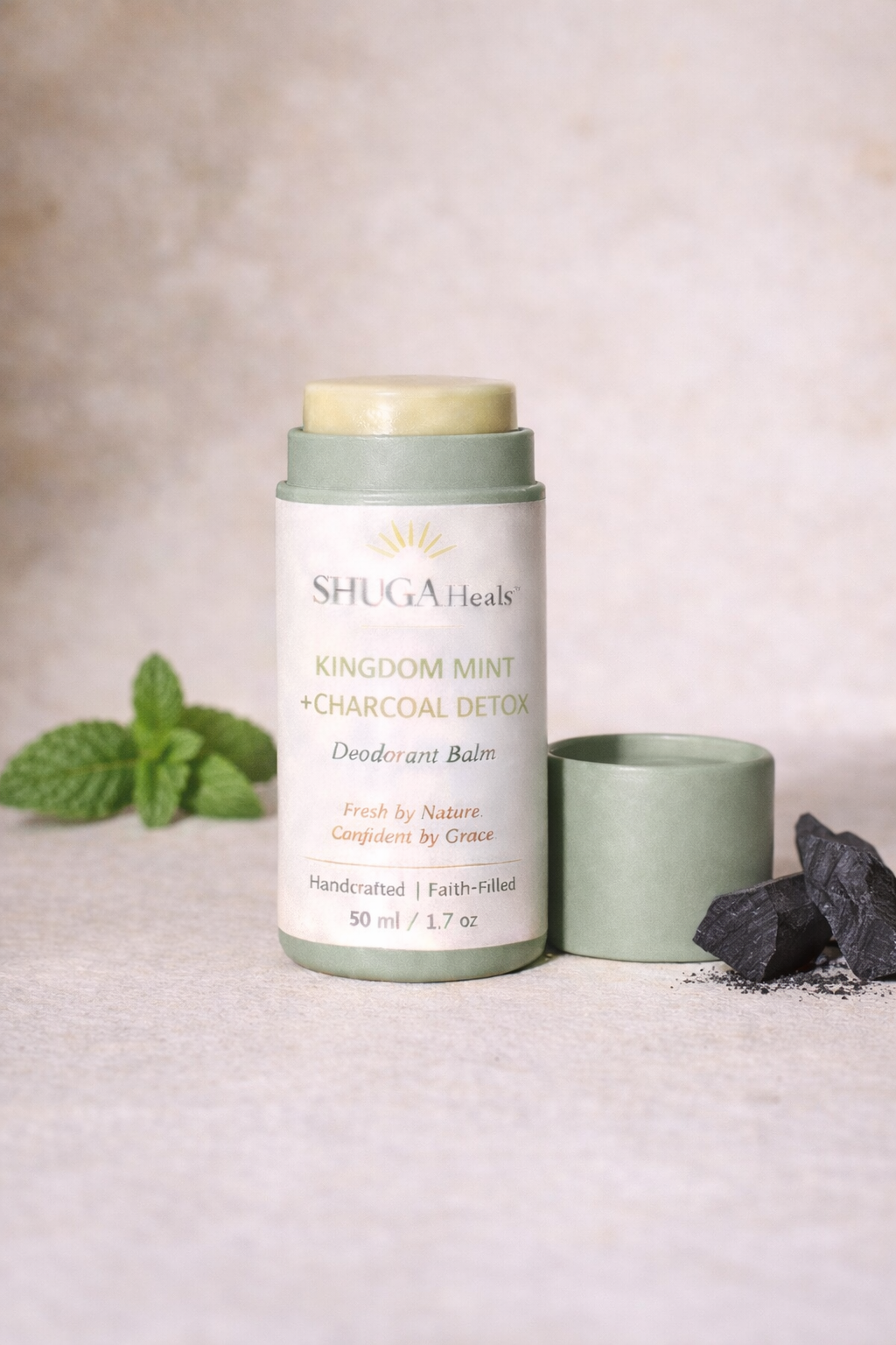 Detox and refresh with Kingdom Mint + Charcoal by SHUGA Heals™. A cooling, aluminum-free natural deodorant balm designed for clean confidence and daily freshness.