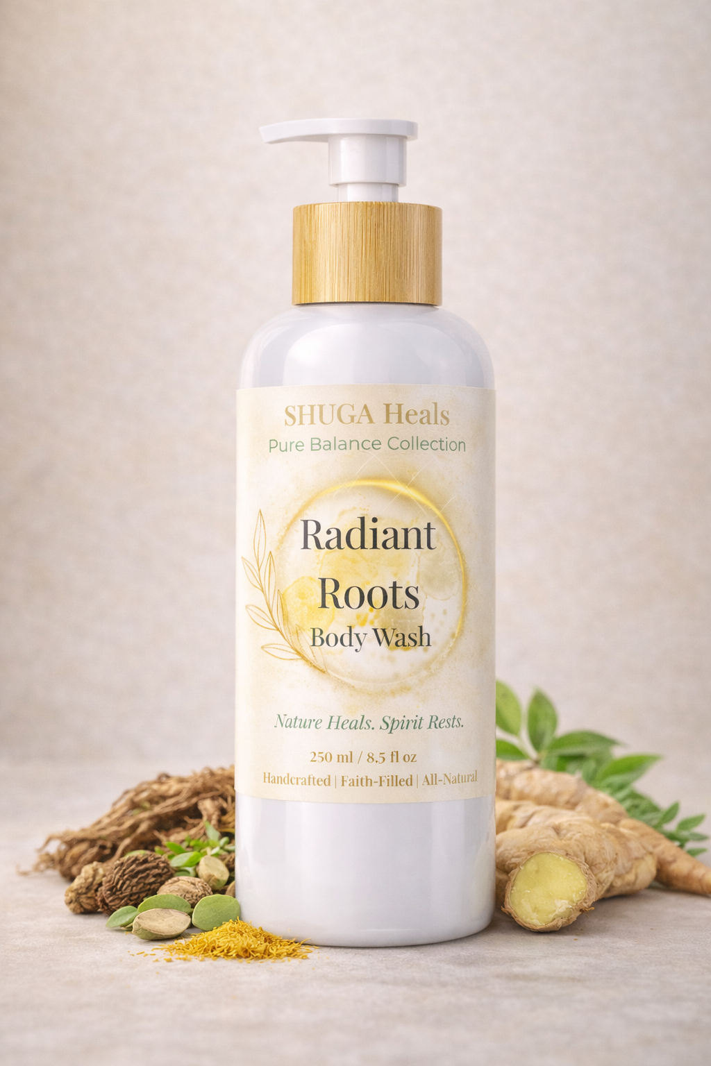 Radiant Roots Body Wash detoxifies and refreshes with African black soap infused with neem and moringa. A grounding, plant-powered cleanse designed for holistic skin renewal.